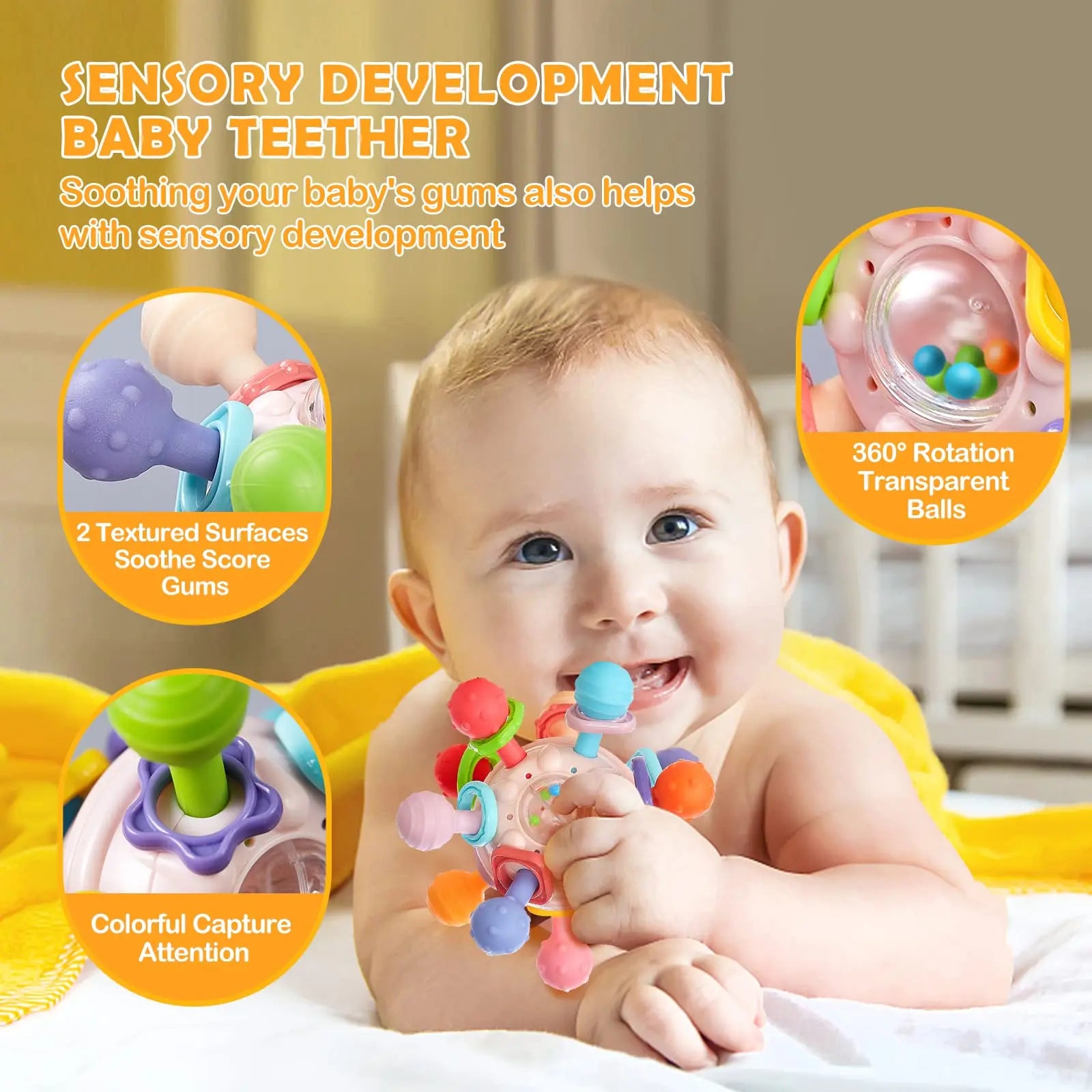 - Guľaté hryzátko s 12 strategicky umiestnenými výstupkami efektívne masíruje dentálne lôžko, čím stimuluje zmyslový vývoj dieťaťa. Špeciálna štruktúra povrchu poskytuje cielenú masáž ďasien, ktorá významne zmierňuje diskomfort spojený s prerezávaním zúbkov.